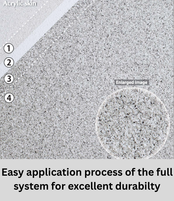 Grani Queen Roller is a new type of decorative texture paint finish for interior and exterior to simulate natural stone effect with roller. It is water based high build acrylic silicone resin texture body for lightweight stone like appearance on wall surfaces. Areas of Use: To create stone like texture coating, ideal for interior and exterior of residential, commercial buildings, institutional projects, hotel lobbies, lift lobbies, feature walls, etc. Surfaces of concrete,,mortar,,masonry,,soft and hard boards, wood, gypsum plaster board, metal surfaces, etc Characteristics: - Creates an elegant and unique stone effect simulating smooth natural stone finish. - Can be easily applied. -Highly durable. - Excellent water and weather resistance when coated with SKK clear topcoat. - Fungus and algae resistance. - Excellent water and weather resistance when coated with SKK clear topcoat. -Lightweight and versatile in design. 7 coat system consists of the following: - 1 coat CT Under primer for strong bonding of texture with roller/brush. - 2 coats Grani Queen Basecoat by roller/brush. - 2 coats Grani Queen Roller with GQ Roller. - 2 coats SK Silicon Clear W topcoat for excellent weather resistance by roller/brush.t