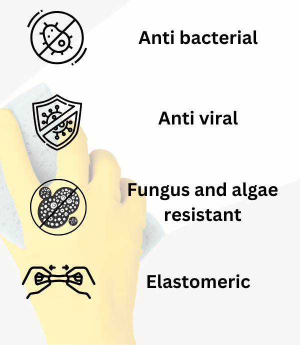 Anti-bacterial and Anti-viral semi-elastomeric Interior Paint Areas of use: Interior Wall of hospitals, clinics, medical facilities, food processing plants, public facilities, restaurants, cafeteria, residential homes etc surfaces of concrete calcium silicate board, slate board, plaster board etc Characteristics: - Water-based reactive curing type acrylic resin emulsion paint contains inorganic anti-bacterial agent as main element for strong anti-bacterial action on MRSA (Methicillin-Resistant Staphylococcus Aureus), Pseudomonas aeruginosa, Escherichia coli, Candida Albican, Coxsackievirus type A16, Enterovirus Type 71. - Highly resistant to surface and hairline cracks due to elastomeric property. - Anti-bacterial action from contact with inorganic anti-bacterial agent. - Anti-bacterial action by active oxygen. - Low VOC (Volatile Organic Compounds) and low odour. - Protects against diseases such as Hand, Foot. And Mouth Disease (HFMD). - Outstanding resistance against fungus and algae growth. - Anti-mould. - Chemical and alkali resistance. - Excellent adhesion strength onto substrates. - Washable.